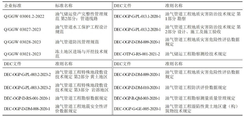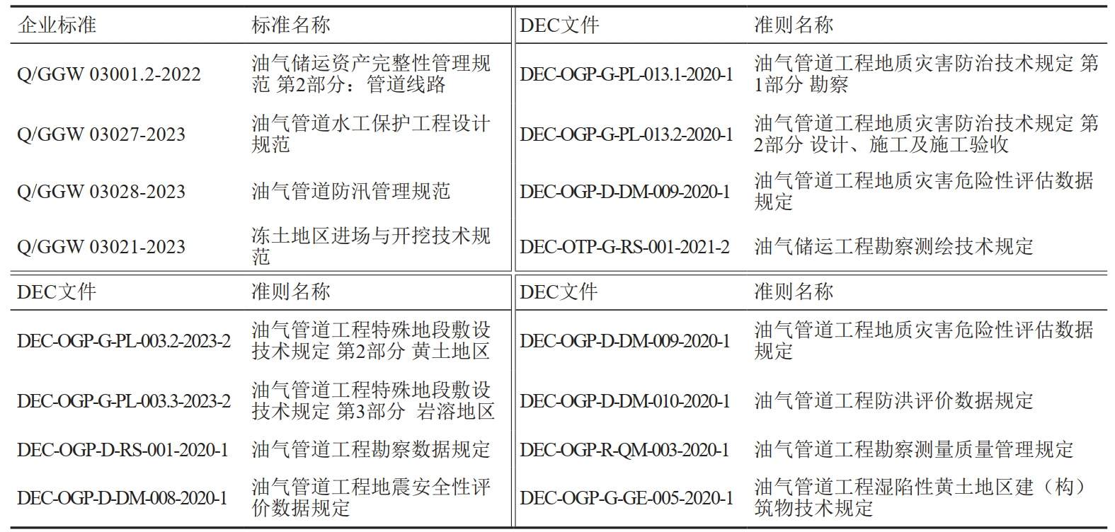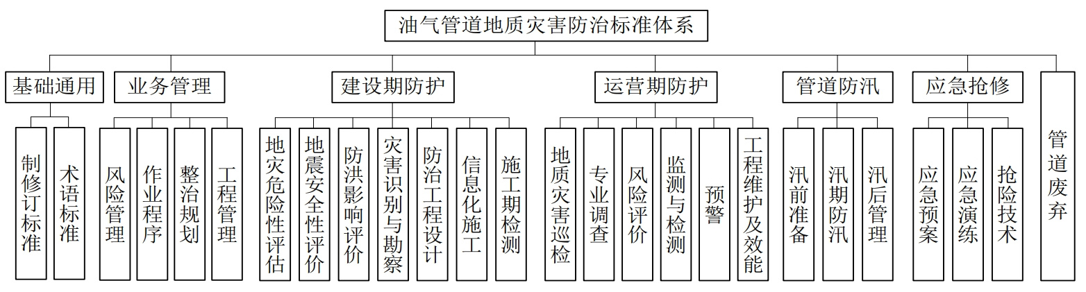 以國際標(biāo)準、國家標(biāo)準、石油天然氣行業(yè)標(biāo)準、地礦/水利行業(yè)標(biāo)準、中國地質(zhì)災(zāi)害防治工程行業(yè)協(xié)會團體標(biāo)準、管網(wǎng)集團企業(yè)標(biāo)準/設(shè)計與工程建設(shè)準則(DEC)為依托,聚焦建設(shè)期勘察設(shè)計、運營期專業(yè)排查、風(fēng)險評價、監(jiān)測預(yù)警、工程防治(含水工保護)、效能評價、防汛抗洪、應(yīng)急搶險和風(fēng)險管理等主體方向構(gòu)建標(biāo)準體系。