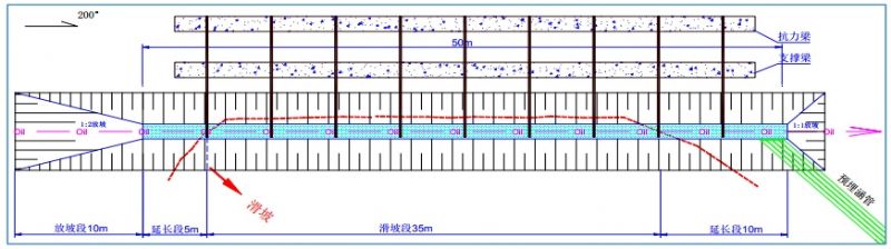 圖 2 管道開挖及懸臂梁垂吊穩(wěn)管措施垂直坡面投影圖