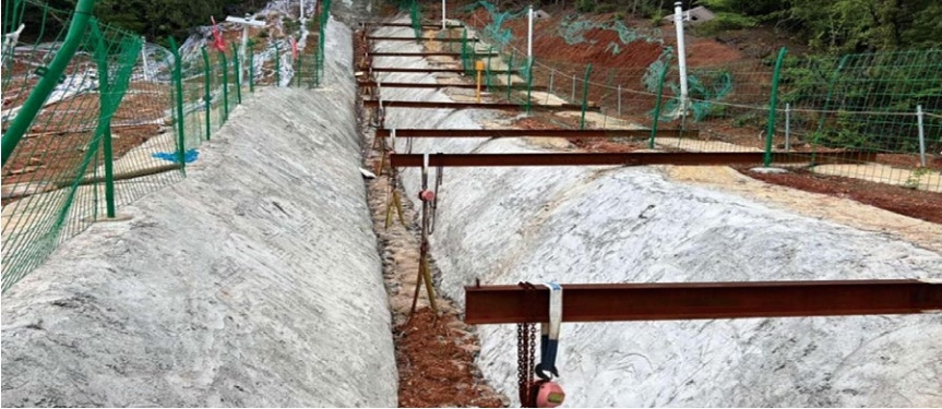 (4)懸吊管道穩(wěn)管。采用懸臂梁吊拉,利用管道處在滑坡邊緣的有利條件,將支撐梁和抗力梁設(shè)置在穩(wěn)定的坡體上(圖 3)。