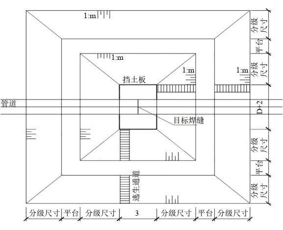 按照“后建服從先建”的原則,光伏發(fā)電項(xiàng)目與管道的間距必須滿足管道企業(yè)開展維檢修作業(yè)的需要。以環(huán)焊縫隱患治理為例,根據(jù)管道加裝B型套筒作業(yè)的作業(yè)坑開挖要求,分級(jí)放坡,每級(jí)開挖深度為1~3米,每級(jí)加設(shè)平臺(tái)。平臺(tái)寬度根據(jù)現(xiàn)場(chǎng)土質(zhì)地貌、施工方式和風(fēng)險(xiǎn)情況確定,此處根據(jù)前述地質(zhì)條件取0.5米。作業(yè)坑底部尺寸為3米×(D+2)米,其中D為管徑。西氣東輸二線管道管徑為1219厘米,故作業(yè)坑底部的尺寸為3米×3.2米左右。考慮粉土的巖土力學(xué)特性,作業(yè)坑的上部開口按照1∶1比例放坡。管道頂部埋深在塬面地貌2.5米~3.5米,按照1219厘米管徑,管道底部埋深即在3.7米~4.7米,放坡按照三級(jí)放坡,取4.7米的最大埋深。