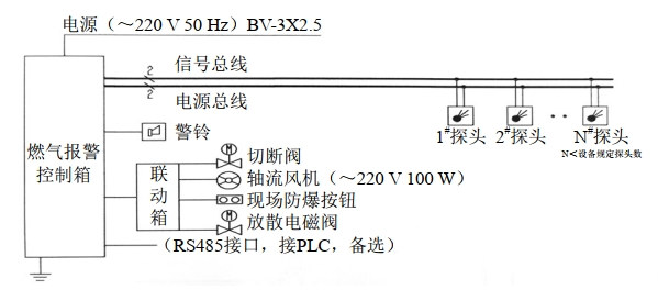 圖 1 可燃氣體報警系統(tǒng)示意圖(總線制)