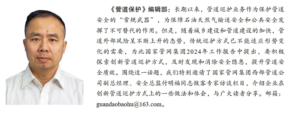 編輯部:國(guó)家管網(wǎng)集團(tuán)2024年工作報(bào)告提出,要積極探索創(chuàng)新管道巡護(hù)方式。近年來(lái)西部管道公司開展了哪些工作,您認(rèn)為實(shí)現(xiàn)這一目標(biāo)還要做哪些努力?
