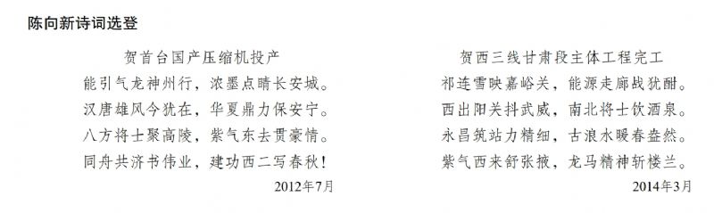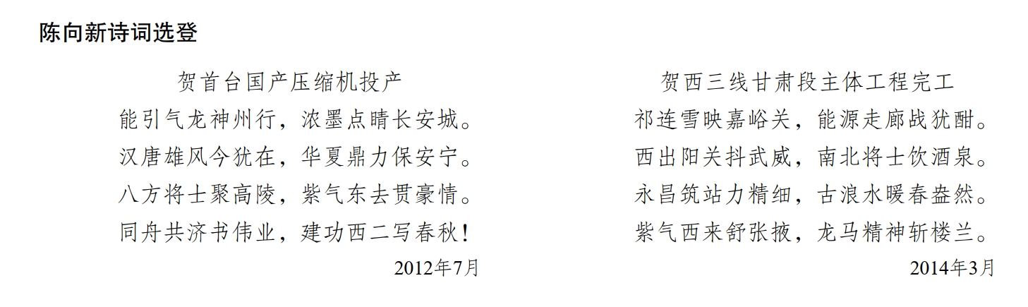 2012年,在西二線干線投產(chǎn)之際,我按捺不住激動(dòng)的心情,寫(xiě)下了一首詩(shī):大勢(shì)磅礴氣東行,鑄就國(guó)脈貫豪情。天山祁連奔南嶺,伏牛羅霄飲酒泉。萬(wàn)里筑龍?jiān)坪驮拢妮d征戰(zhàn)艱與難。九十偉業(yè)獻(xiàn)厚禮,氣貫珠江盡開(kāi)顏。