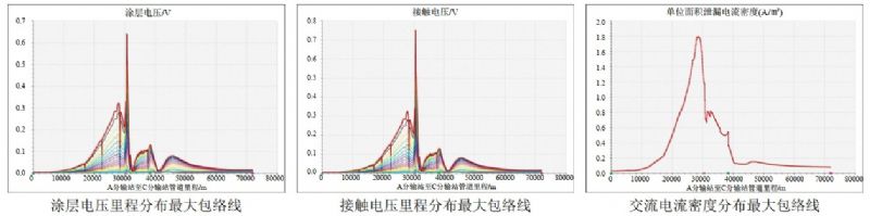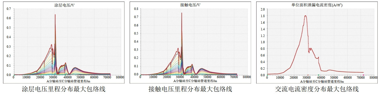 軌道交通上行方向單線單車行駛。基于CDEGS軟件繪制管道沿線的不同交流干擾電壓分布曲線,提取機(jī)車處于30個(gè)不同位置時(shí)管道沿線各個(gè)位置的交流干擾電壓最大值繪制最大交流干擾包絡(luò)線,最大值出現(xiàn)軌道交通與埋地管道交叉的位置,在B分輸站絕緣接頭的位置有峰值回轉(zhuǎn)現(xiàn)象。管道沿線最大交流干擾電壓為0.507 V,遠(yuǎn)小于安全限值15 V標(biāo)準(zhǔn)。管道沿線最大涂層電壓為0.639 V,遠(yuǎn)小于安全限值15 V標(biāo)準(zhǔn);地面可接觸物體(如測(cè)試樁、閥室等)的最大接觸電壓為0.751 V,也未超過安全限值15 V標(biāo)準(zhǔn)。流過1 cm²缺陷孔的最大泄漏電流密度為1.795 A/m²,低于30 A/m²,交流腐蝕風(fēng)險(xiǎn)為低(圖 2)。