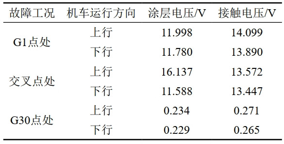 由前文單線單車在每個(gè)位置對(duì)管道的交流干擾水平來看,機(jī)車從G1點(diǎn)至G30點(diǎn)位依次移動(dòng)時(shí),管線交流干擾最大值逐漸減小,因此單線接觸線與鋼軌短路故障選擇在G1點(diǎn);交流干擾最大值出現(xiàn)在管道與輕軌交叉的位置附近,即交叉位置為重點(diǎn)觀測(cè)點(diǎn);最后一處故障位置選擇供電區(qū)間端點(diǎn)G30作為對(duì)比。