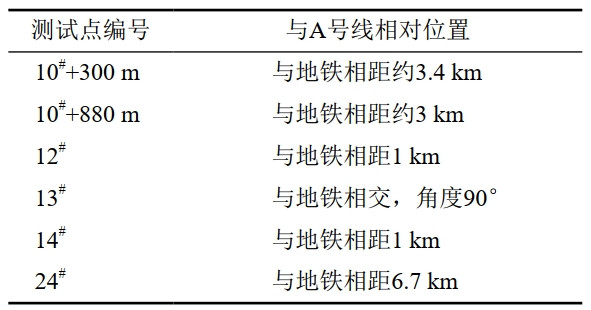 2022年建成投用的某原油長輸管道總長度約340 km,管徑762 mm,壁厚10.3 mm /11.9 mm,管道設(shè)計壓力8.0 MPa,運行壓力4.0 MPa。管道采用強制電流陰極保護方式進行保護。該長輸管道與地鐵軌道交通A號線交叉于13#測試樁,陰極保護系統(tǒng)運行受到干擾,陰極保護電位波動明顯,保護電源無法采用恒電位模式平穩(wěn)運行。為開展管道雜散電流測試分析,劃定試驗區(qū)域,設(shè)置管道測試點與干擾源位置(表 1、圖 1)。