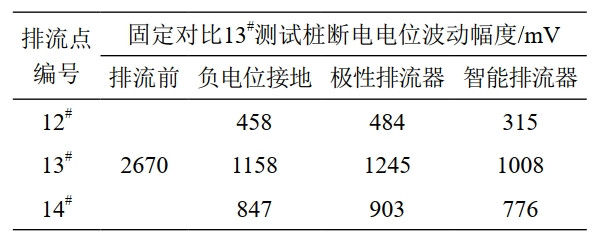 為了驗證排流點選址及排流方式的不同對排流效果的影響,試驗分別選擇在管道與地鐵交叉點(13#測試樁)及交叉點上下游測試樁(12#、14#測試樁),利用原有地床進行雜散電流排流實驗,分別采取負(fù)電位接地排流、極性排流器排流、智能排流器排流三種排流方式。