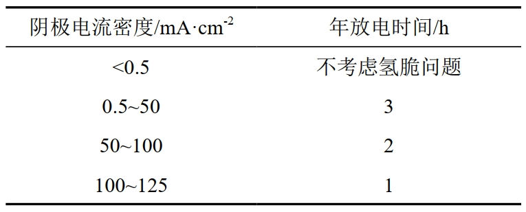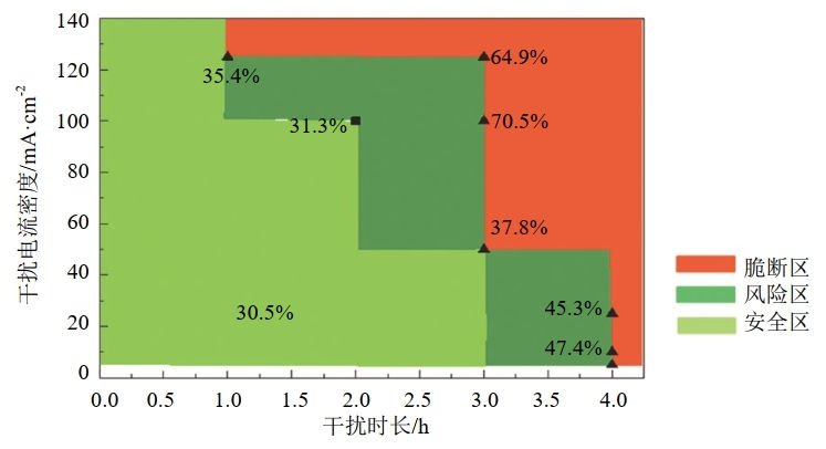 獲得高壓直流干擾電參數(shù)、環(huán)境因素等對氫脆的影響規(guī)律,確定放電時不同電流密度下,接地極年放電時間的限制,形成高壓直流干擾氫脆控制安全邊界(表 2、圖 2),當(dāng)干擾時長和干擾電流位于圖譜紅色區(qū)間時,X80鋼具有氫脆風(fēng)險。