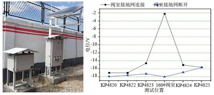 線路管道采取絕緣接頭分段和鋅帶排流的防護方案,有效降低了管道沿線干擾電壓和腐蝕速率。在站場閥室研發(fā)了大功率排流器,實現(xiàn)了管地間高電壓等電位處理。排流器最大排流量可達240 A,并具備管地電壓自動監(jiān)測和超壓時等電位連接功能,可消除站場閥室放電燒蝕風(fēng)險。現(xiàn)場實施后有效降低了站場閥室燒蝕和線路管道腐蝕風(fēng)險(圖 3~圖 5)。