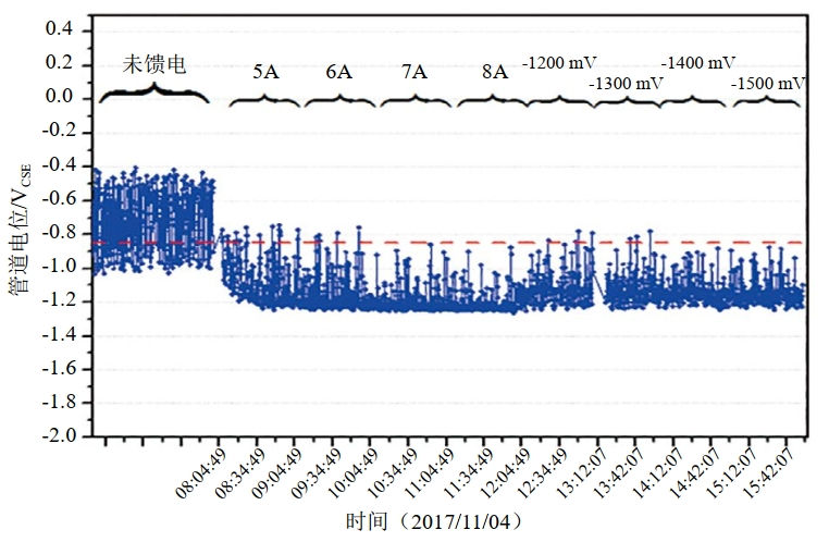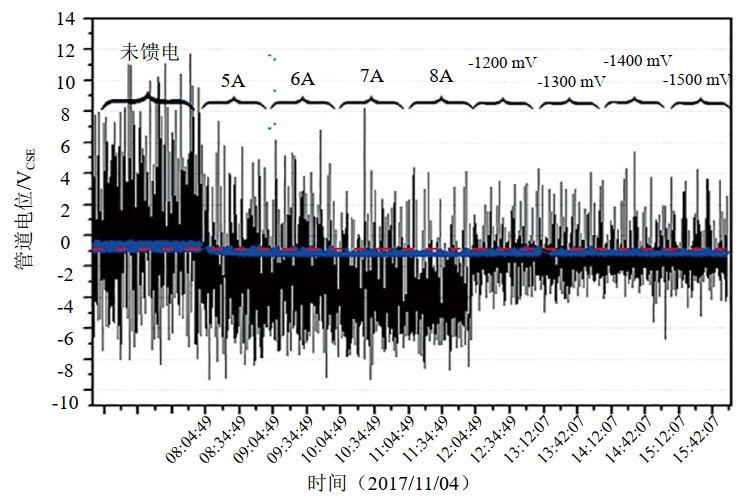 對地鐵等動態(tài)直流干擾采用強制電流陰極保護和極性排流聯(lián)合防護方式,有效減少雜散電流流入,全線電位水平均得到改善。陰保系統(tǒng)在恒位、恒流工作模式下,通電電位波動幅值減小,斷電電位明顯負(fù)向偏移,陰極保護有效(圖 6)。