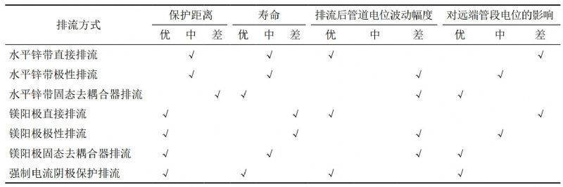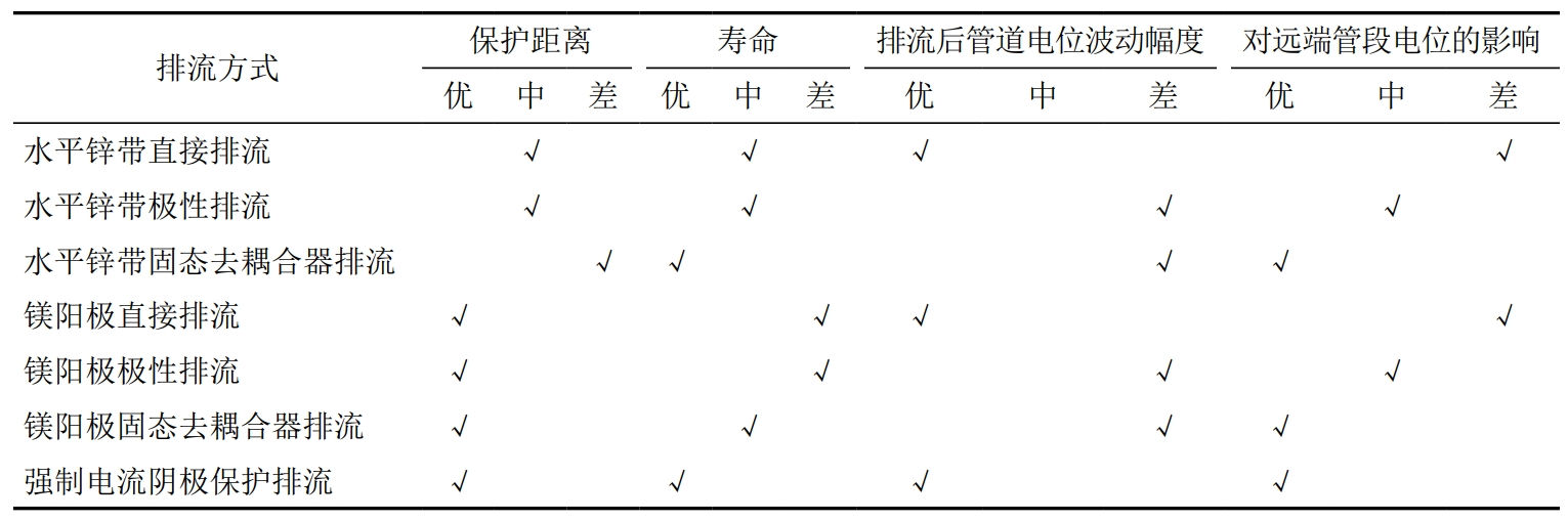 采用現(xiàn)場排流試驗測試研究了不同排流地床和排流器組合下的排流效果,明確了交直流交互作用工況下有效的緩解措施及其作用范圍,強制電流陰極保護排流可在較長距離范圍內(nèi)有效抑制動態(tài)直流干擾,對于動態(tài)直流干擾治理效果最佳,但對于交流干擾改善不理想。犧牲陽極接地排流不適合動態(tài)正向干擾強度高的情況下,犧牲陽極接地排流可在有限的范圍內(nèi)對交流和直流干擾有一定程度的緩解。其中鋅帶直接排流時管道保護效果較差,而采用鎂帶直接排流時管道陰極保護全時刻達標(biāo)。排流地床不同連接方式時,直接排流的效果優(yōu)于極性排流,極性排流優(yōu)于固態(tài)去耦合器排流。三種連接方式下,遠(yuǎn)端管道電位均無正向偏移。基于獲得的防護措施適用性和有效作用范圍研究成果,明確了單一的排流方式均存在一定的弊端,在實際的工程應(yīng)用中應(yīng)根據(jù)實際需求針對性選用綜合控制措施,確保排流效果(表 4)。
