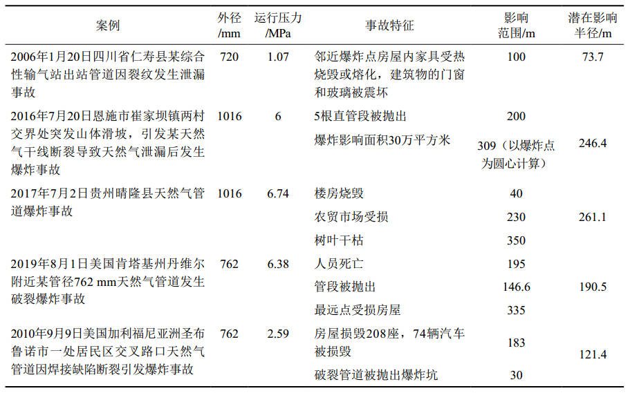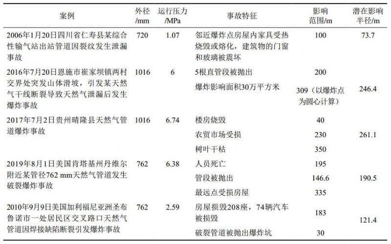 綜上分析,以國內(nèi)天然氣長輸管道常用管徑1016 mm為基礎(chǔ),對比同等條件下潛在影響半徑計算結(jié)果(310 m),可以發(fā)現(xiàn)潛在影響半徑計算結(jié)果范圍能夠涵蓋相同條件下水平噴射火焰熱輻射通量、瞬時燃燒熱輻射通量、蒸氣云爆炸場超壓損傷范圍。