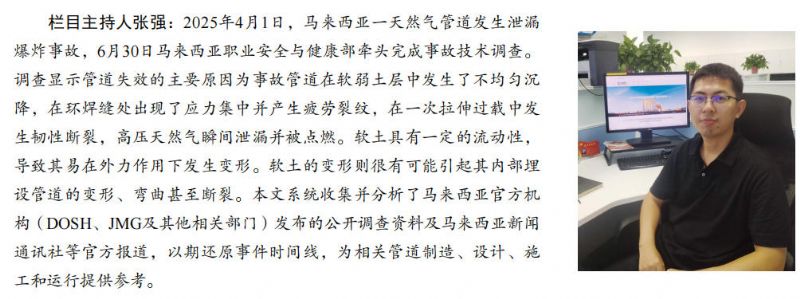 欄目主持人張強:2025年4月1日,馬來西亞一天然氣管道發(fā)生泄漏爆炸事故,6月30日馬來西亞職業(yè)安全與健康部牽頭完成事故技術調查。調查顯示管道失效的主要原因為事故管道在軟弱土層中發(fā)生了不均勻沉降,在環(huán)焊縫處出現(xiàn)了應力集中并產生疲勞裂紋,在一次拉伸過載中發(fā)生韌性斷裂,高壓天然氣瞬間泄漏并被點燃。軟土具有一定的流動性,導致其易在外力作用下發(fā)生變形。軟土的變形則很有可能引起其內部埋設管道的變形、彎曲甚至斷裂。本文系統(tǒng)收集并分析了馬來西亞官方機構(DOSH、JMG及其他相關部門)發(fā)布的公開調查資料及馬來西亞新聞通訊社等官方報道,以期還原事件時間線,為相關管道制造、設計、施工和運行提供參考。
