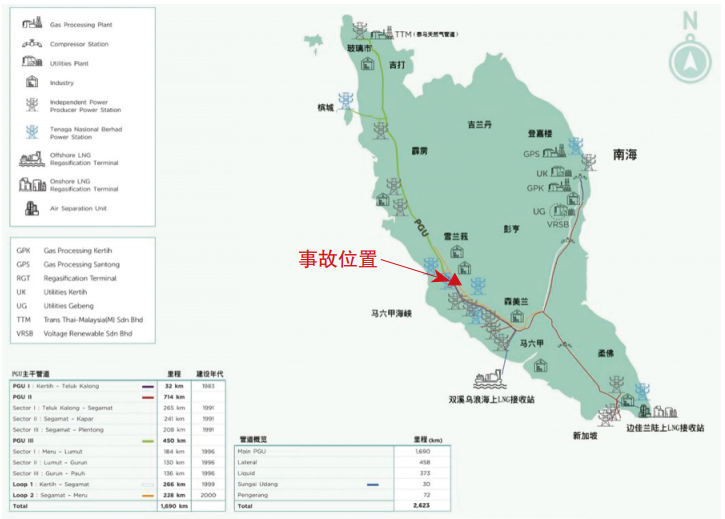 事故管道是馬來西亞半島氣體利用率公司(Peninsular Gas Berhad,PGB)所轄半島天然氣管道系統(tǒng)(Peninsular Gas Utilization,PGU))的一部分,也是馬來西亞最長的天然氣管道。PGU管道系統(tǒng)干支線全長2623 km,管道呈“Y”字形,從1983—2000年分三個階段建設,將登嘉樓、沙巴和沙撈越(Terengganu,Sabah和Sarawak)等近海氣田開采的天然氣輸送到Kertih處理廠,再通過PGU管道系統(tǒng)輸送到整個馬來半島,設計輸氣能力為20億標準立方英尺/天(BSCFD),管徑50.8 mm~1219 mm,為馬來西亞半島的電力、工業(yè)和商業(yè)領域的終端用戶和新加坡的電廠提供管道天然氣。