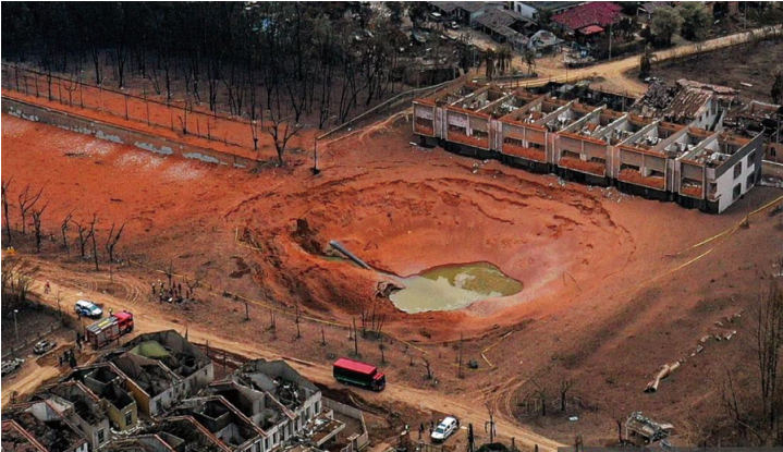 事故現(xiàn)場形成了巨大的橢圓形爆炸坑,深度約9.8 m、跨度約為80 m×60 m,約30000 t的土壤碎片散落在300 m的半徑范圍內(圖 3)。從爆坑邊緣30 m內的單層排屋僅剩地基和扭曲鋼筋;60 m~100 m范圍內屋頂瓦片被掀飛,墻體出現(xiàn)貫通裂縫。爆心50 m內12輛轎車僅剩焦黑車架,輪胎完全燒毀;距離爆心120 m處,路燈桿向爆坑方向彎曲30°,燈罩熔化呈“淚滴”狀;汽車鋁合金輪轂軟化后重新凝固成不規(guī)則團塊。150 m外車輛玻璃呈蛛網狀裂紋但車體基本完好。爆坑邊緣向外延伸150 m~200 m的扇形高溫灼燒區(qū),草皮完全碳化,呈黑白相間的“灰燼地毯”(圖 4)。無人機航拍可見爆坑呈明顯的“子彈形”,最遠波及500 m外的棕櫚樹林,樹葉呈放射狀倒伏。
