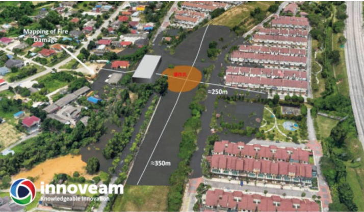 2025年4月1日上午約8點10分,馬來西亞國家石油和天然氣公司(Petronas)所轄的一天然氣管道發(fā)生泄漏爆炸事故并引發(fā)大火,事故發(fā)生在馬來西亞雪蘭莪州蒲種市,火焰高達30 m,有目擊者稱火柱數(shù)百米、形成蘑菇狀火球,遠在數(shù)公里外清晰可見,爆炸中心附近溫度高達約1000℃。事故未造成人員死亡,約150人受傷,67人住院治療;爆炸半徑325 m范圍內的439套房屋中219套房屋受到了不同程度的損壞,其中87套嚴重焚毀,132套房屋受損或成為危樓(圖 1)。275輛汽車和56輛摩托車被毀。事故造成經濟損失估計在6430萬令吉(約1460萬美元)。警方對事故現(xiàn)場周邊500 m范圍進行了管控并對管控范圍內的500余人進行了疏散。