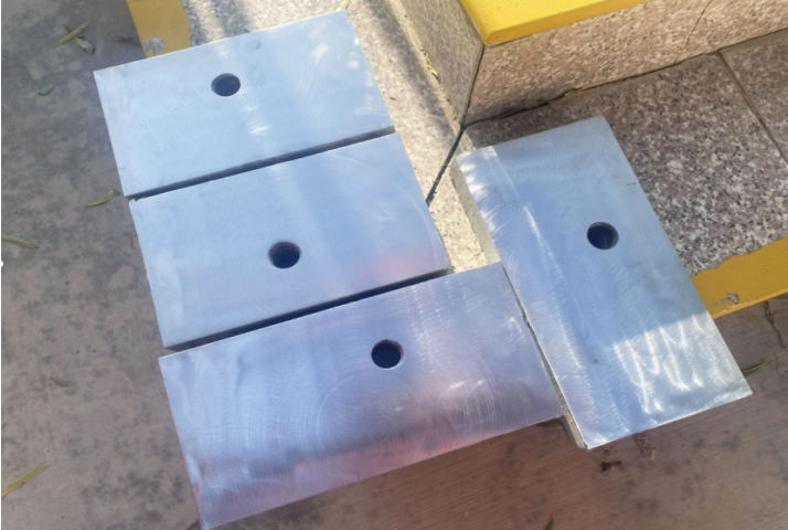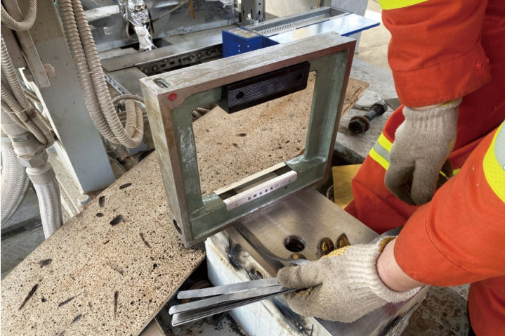 針對(duì)以上問題,檢修人員決定采用基礎(chǔ)調(diào)平的方法,對(duì)基礎(chǔ)進(jìn)行修復(fù)打磨或重建基礎(chǔ)平面,使其平面度偏差≤0.1 mm/m,有效改善振動(dòng)影響。現(xiàn)場(chǎng)采用角磨機(jī)切割電機(jī)基礎(chǔ)上的支墩墊塊,送往機(jī)械加工廠進(jìn)行車削研磨(圖 2);使用框式水平儀輔助校正并重新焊接,同時(shí)測(cè)量基礎(chǔ)各點(diǎn)水平度(圖 3);利用塞尺檢測(cè)電機(jī)底座與基礎(chǔ)間的間隙,判斷平面度偏差,隨后恢復(fù)設(shè)備并進(jìn)行機(jī)組對(duì)中、啟機(jī)測(cè)試。