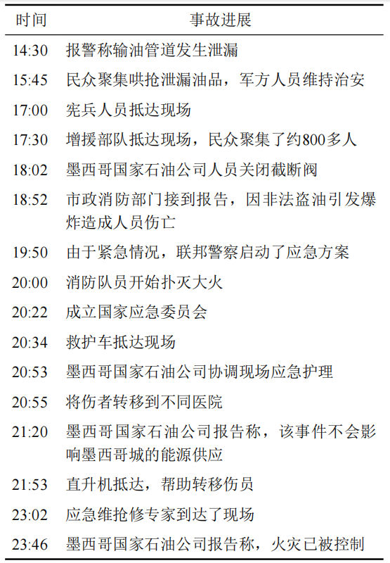 事故管道為墨西哥國家石油公司(Pemex)Tula煉油廠從墨西哥灣海岸至墨西哥城輸送汽油的陸上常溫成品油干線管道,全長270 km、管徑324 mm、管材API 5L X52、壁厚6.4 mm、運行壓力2 MPa。起初泄漏規(guī)模較小為“小水坑”,后如“噴泉”般涌出,噴射高度6 m左右,當?shù)丶s800多名居民蜂擁而上,用水桶、垃圾桶等非防爆容器哄搶泄漏油品,引起爆炸并導致火災。事故發(fā)生的主要時間線如表 1所示。