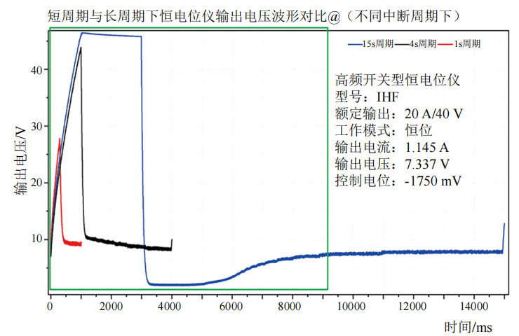圖 3展示了CP-Thinker記錄儀采集的恒電位儀在1 s、4 s、15 s通斷周期時(shí)的輸出電壓波形。在1 s及4 s周期下,恒電位儀能迅速?gòu)臄嚯娀謴?fù)到原始輸出;而在15 s周期且斷電3 s的工況下,恒電位儀約6 s才恢復(fù)到原始輸出。若采用12 s通電、3 s斷電的周期,通電電位的延遲時(shí)間需大于6 s,否則測(cè)試得到的通電電位偏正,因此,更推薦采用4 s或者1 s的較短周期,以確保恒電位儀響應(yīng)更及時(shí),檢測(cè)效率也更高。