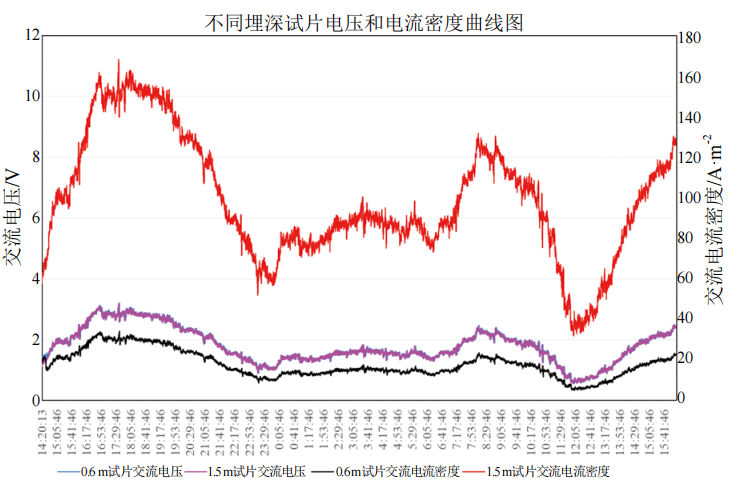 圖 5展示的是在同一位置、同一時(shí)段下,不同埋設(shè)深度的試片所測(cè)得的交流干擾數(shù)據(jù)。兩個(gè)試片的交流電壓基本一致,交流電流密度存在明顯差異,評(píng)估的交流干擾腐蝕風(fēng)險(xiǎn)等級(jí)也不同。這種差異源于不同土壤電阻率,導(dǎo)致試片發(fā)散電阻顯著不同。
