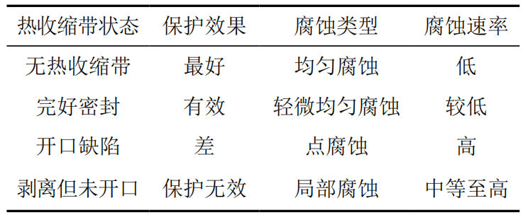 (3)在僅有熱收縮帶破損但未發(fā)生黏結(jié)/密封失效的樣本中,腐蝕程度多為C1或C2級,說明只要底層黏結(jié)良好,陰極保護(hù)系統(tǒng)仍能在一定程度上發(fā)揮作用。