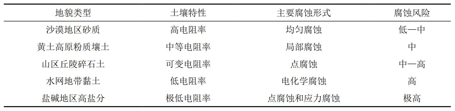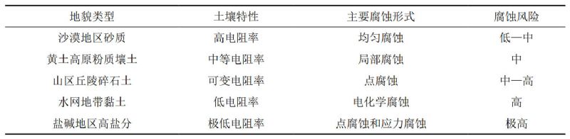 (3)不同地貌環(huán)境的腐蝕風(fēng)險(xiǎn)。天然氣長輸管道經(jīng)過多種地貌環(huán)境,包括沙漠地區(qū)、黃土高原、山區(qū)丘陵和水網(wǎng)地帶等,每種地貌具有獨(dú)特的土壤特性和腐蝕風(fēng)險(xiǎn)(表 2)。