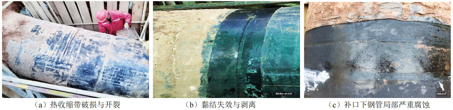 (1)補(bǔ)口失效模式。管道補(bǔ)口失效主要表現(xiàn)為兩種形式:一是熱收縮帶與管體三層聚乙烯防腐層搭接部位密封失效,呈現(xiàn)剝離狀態(tài);二是熱收縮帶與補(bǔ)口部位的管體、PE局部黏結(jié)差,導(dǎo)致熱收縮帶可從管體上輕松剝離。這些失效模式使得水分和腐蝕性物質(zhì)得以侵入管道表面,引起腐蝕。