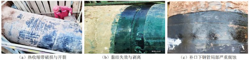 (3)施工質(zhì)量因素。補(bǔ)口失效主要由于施工人員責(zé)任心不強(qiáng)、技能水平較低(如底漆漏刷、烘烤不足等)及現(xiàn)場監(jiān)管不到位等原因?qū)е隆崾湛s帶施工為手工烘烤,加熱不均勻?qū)е聼崛勰z局部未熔融處形成空鼓;原有結(jié)構(gòu)為濕膜法施工,安裝熱收縮帶時(shí)底漆已固化,熱熔膠與固化后的底漆表面黏結(jié)效果差所導(dǎo)致的剝離等。