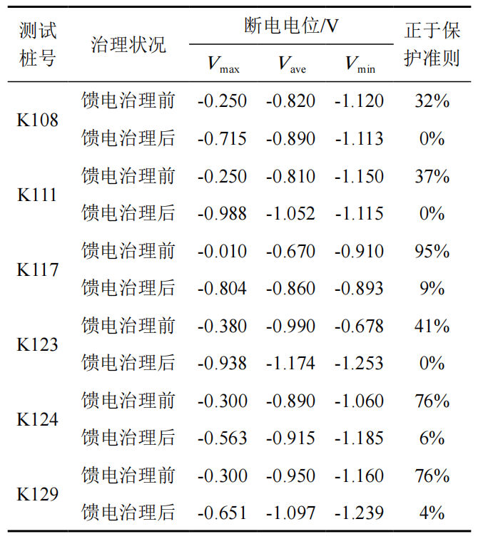表 1 饋電前后陰極保護效果判定結(jié)果