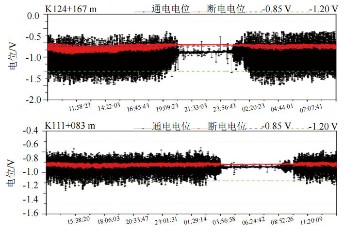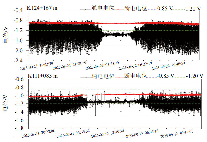 實驗結(jié)果表明,饋電段管道的斷電電位基本穩(wěn)定在SY/T0087.4標(biāo)準(zhǔn)要求的評價指標(biāo)﹣0.85 VCSE~ ﹣1.20 VCSE區(qū)間,無明顯正向偏移,表明治理措施能抑制雜散電流干擾,使區(qū)間內(nèi)管線處于有效保護狀態(tài)。若區(qū)間內(nèi)存在極個別欠保護位置,后期應(yīng)考慮通過施加極性排流的方式進一步優(yōu)化防護效果。