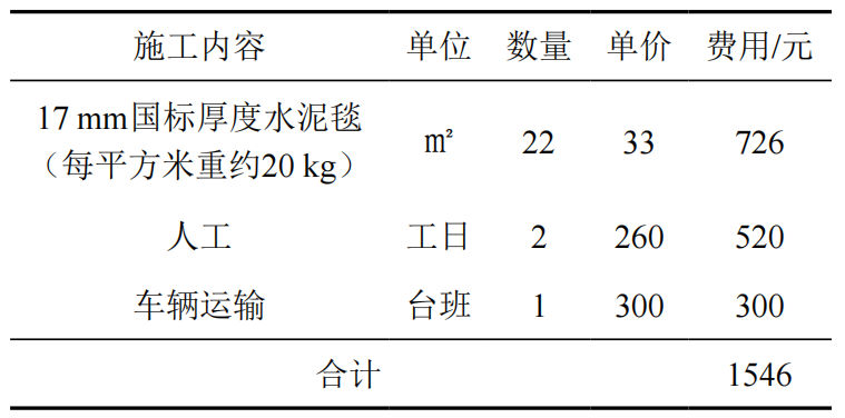 以一處普通溝渠防護(hù)施工為例,溝寬2 m、深1 m、防護(hù)長(zhǎng)度6 m,需防護(hù)施工的表面積約21.6 ㎡,采用15 mm~20 mm厚度的混凝土帆布,單件平面尺寸寬2 m,長(zhǎng)3 m~5 m,重量通常為20 kg/m²,費(fèi)用合計(jì)1546元(表 1)。