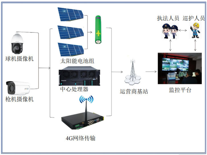 通過4G網(wǎng)絡(luò)無線組網(wǎng),利用一體化離線太陽能供電系統(tǒng)持續(xù)提供穩(wěn)定電源,大幅降低了設(shè)備維護成本。根據(jù)地形特征,監(jiān)控立桿高度6~12米不等,儲供電裝置由3組120W60A太陽能板和鋰電池組構(gòu)成,可保障設(shè)備連續(xù)工作120小時。系統(tǒng)采用的攝像機具備23倍光學變焦、400萬像素和夜視功能,可在高空360°旋轉(zhuǎn),實現(xiàn)全方位、全天候監(jiān)控,資料累計存儲時間達30天以上,同時具備實時監(jiān)控、目標跟蹤、聲光示警等功能,發(fā)現(xiàn)異常情況,值守人員第一時間進行預判和分析,并通知附近企業(yè)巡線人員前往查證識別。管道執(zhí)法人員還可以通過手機實時瀏覽管道周邊實況,及時處理、轉(zhuǎn)交異常情況和問題。針對大型第三方交叉施工作業(yè),設(shè)立臨時監(jiān)控點,通過監(jiān)控系統(tǒng)上傳至監(jiān)管平臺,配合管道企業(yè)對第三方施工過程進行全程監(jiān)督,確保第三方施工單位嚴格按照雙方簽訂的《管道防護協(xié)議》文明施工。