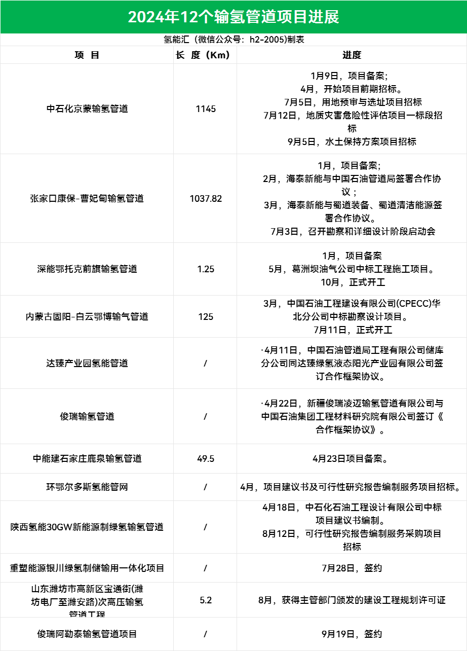 除此以外,2024年還有12個輸氫管道項目取得進展,就公開數(shù)據(jù)顯示,這些項目建成后,我國將擁有長達2363.77km輸氫管道。