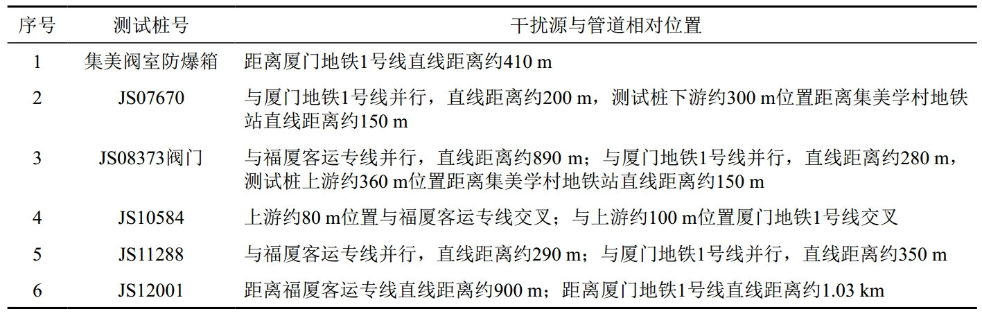集石支線集美閥室內(nèi)設(shè)置強(qiáng)制電流陰極保護(hù)站1座,通過與干線管道跨接對(duì)其進(jìn)行保護(hù),根據(jù)測(cè)試,現(xiàn)場(chǎng)還存在一些地下直連犧牲陽(yáng)極對(duì)其進(jìn)行聯(lián)合保護(hù)。集石支線路由及測(cè)試樁分布如圖 1所示,主要干擾源與管道位置關(guān)系如表 1所示。