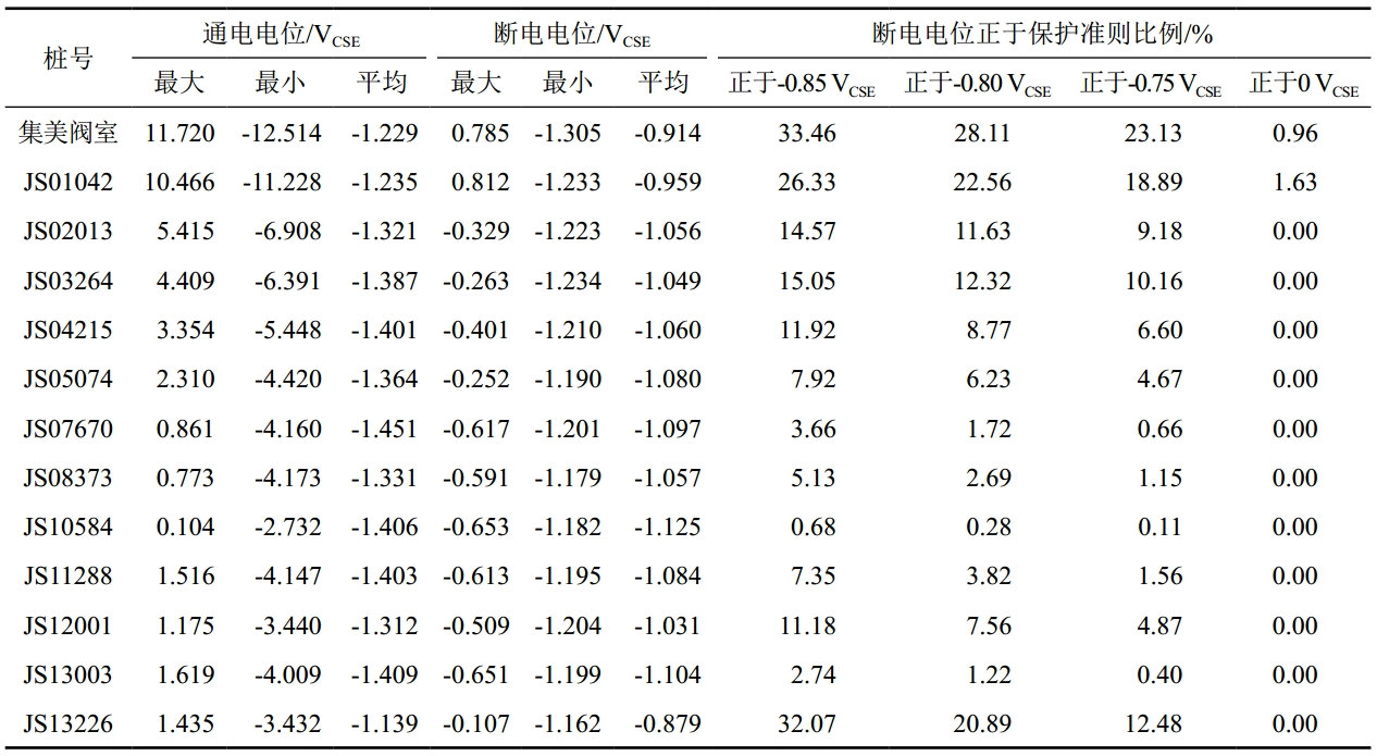 按照GB/T 21448―2017《埋地鋼質(zhì)管道陰極保護(hù)技術(shù)規(guī)范》要求,為控制管道腐蝕需確保陰極保護(hù)電位在﹣0.85 VCSE到﹣1.2 VCSE的可接受范圍內(nèi),陰極保護(hù)電流約在1 A左右。按照AS 2832.1―2015《Cathodic protection of metals,Part1: Pipes and cables》規(guī)定的指標(biāo)進(jìn)行評(píng)價(jià),試片斷電電位正于陰極保護(hù)準(zhǔn)則比例大于5%,為不可接受水平。
