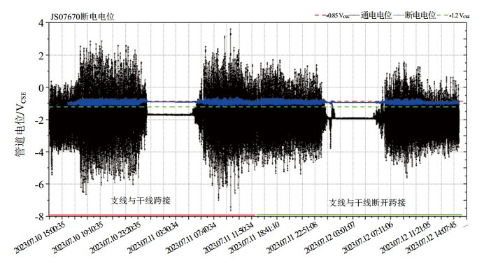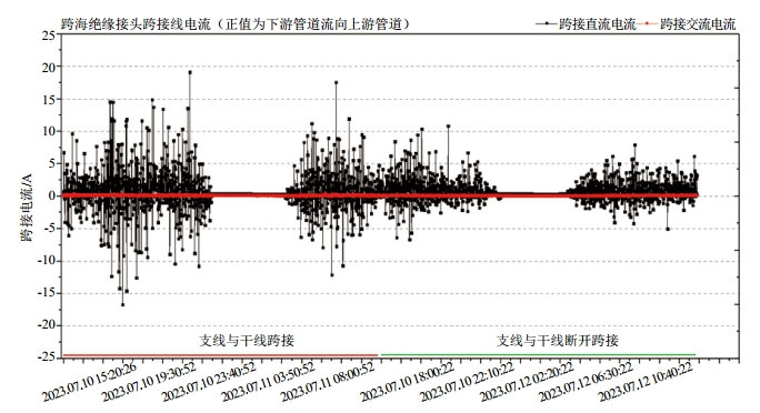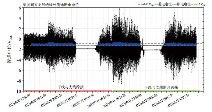 當(dāng)集石支線與干線管道跨接時(shí),地鐵干擾電流會(huì)在干線管道和支線管道之間相互流動(dòng),導(dǎo)致支線管道可能會(huì)受到干線雜散電流的干擾。由圖 3可以看出,當(dāng)干線與集石支線斷開跨接時(shí),跨海絕緣接頭處的跨接電流明顯減小,當(dāng)干線與集石支線跨接時(shí),有較多的干擾電流通過恒電位儀陰極端的跨接處流入流出至管道其他段。因此采用分段絕緣措施通過阻隔干擾電流的流通路徑來減弱雜散電流的干擾影響。
