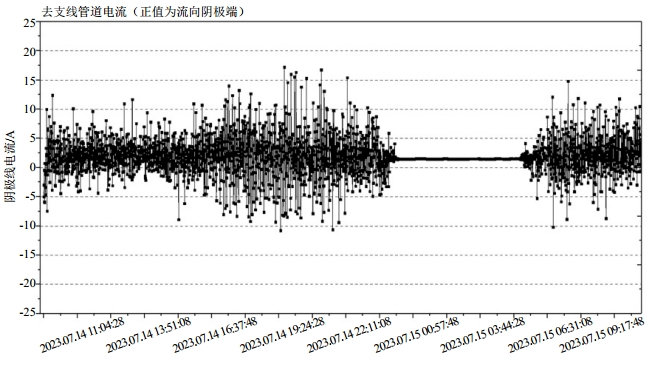 圖 3 跨海絕緣接頭與支線管道陰極端電流分布