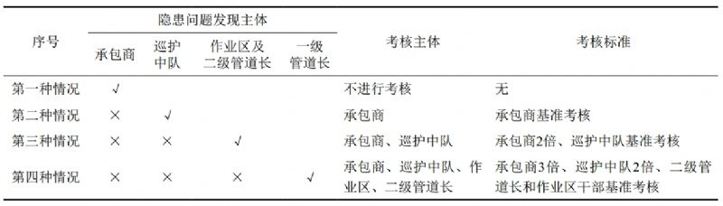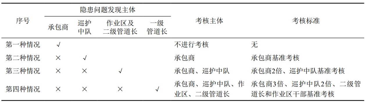 健全體系,發(fā)揮追責(zé)“連環(huán)扣”作用。建立一級管道長、二級管道長、管道運維隊和業(yè)務(wù)承包商逐級監(jiān)督機制,以及遞增式考核的追責(zé)體系(表 1),通過逐級“加碼”、壓力傳導(dǎo),激勵各層級主動發(fā)現(xiàn)和處理問題,有效提升各自安全責(zé)任意識和擔(dān)當(dāng)意識。