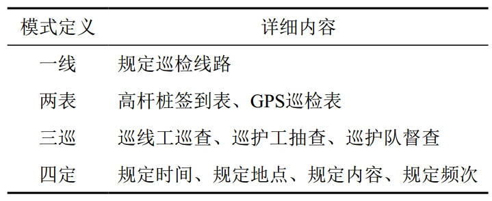 (1)人巡模式。在巡檢通道建立的基礎(chǔ)上,實(shí)行“定量化”與“差異化”相結(jié)合的混合巡護(hù)模式。常規(guī)線路、常規(guī)時(shí)間實(shí)行“定量化”巡護(hù)辦法,實(shí)行“一線、兩表、三巡、四定”巡護(hù)模式(表 1);關(guān)鍵部位和特殊時(shí)期實(shí)行“差異化”巡護(hù)辦法,將巡護(hù)公里數(shù)和巡護(hù)頻次等直接與個(gè)人績效獎(jiǎng)金掛鉤,做到多勞多得、按勞取酬,實(shí)現(xiàn)了管道巡護(hù)時(shí)間上、內(nèi)容上和責(zé)任上的全覆蓋。